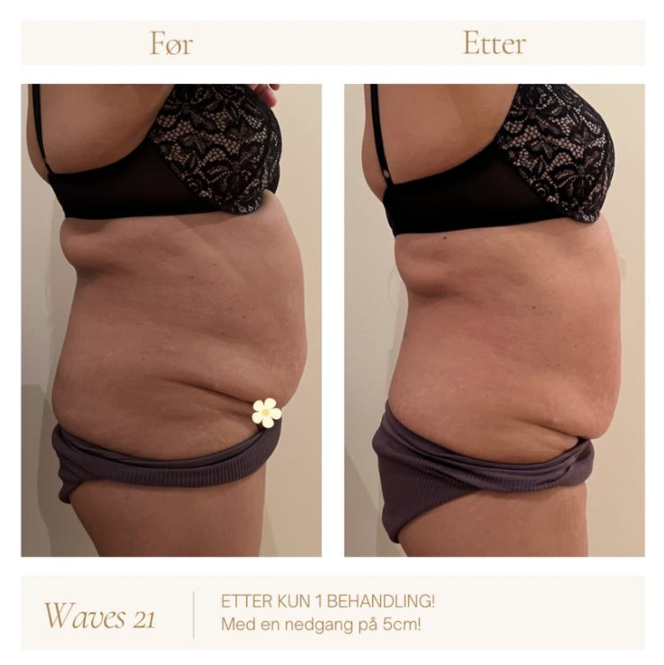 Waves21 kombinerer kuldebehandling (cryoterapi) og elektrostimulering for å fjerne fett og styrke kroppen. Behandlingen virker direkte på både underhudsfett og det vanskelige bukfettet – det du ikke blir kvitt gjennom kosthold og trening alene.
